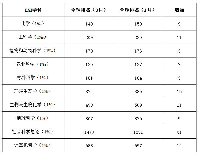 我校工程学、化学、农业科学及植物与动物科学学科已进入ESI全球排名前1‰,本次分别位列209位、149位、120位及170位,排名较上次更新分别提升11位、9位、7位、3位。此外,学校还有6个ESI学科进入全球排名前1%,环境生态学位列374位、材料科学位列181位、生物与生物化学位列498位、地球科学学科位列867位、社会科学总论位列1470位,计算机科学位列683位。排名较上次更新分别提升15位、3位、11位、9位、61位、14位。